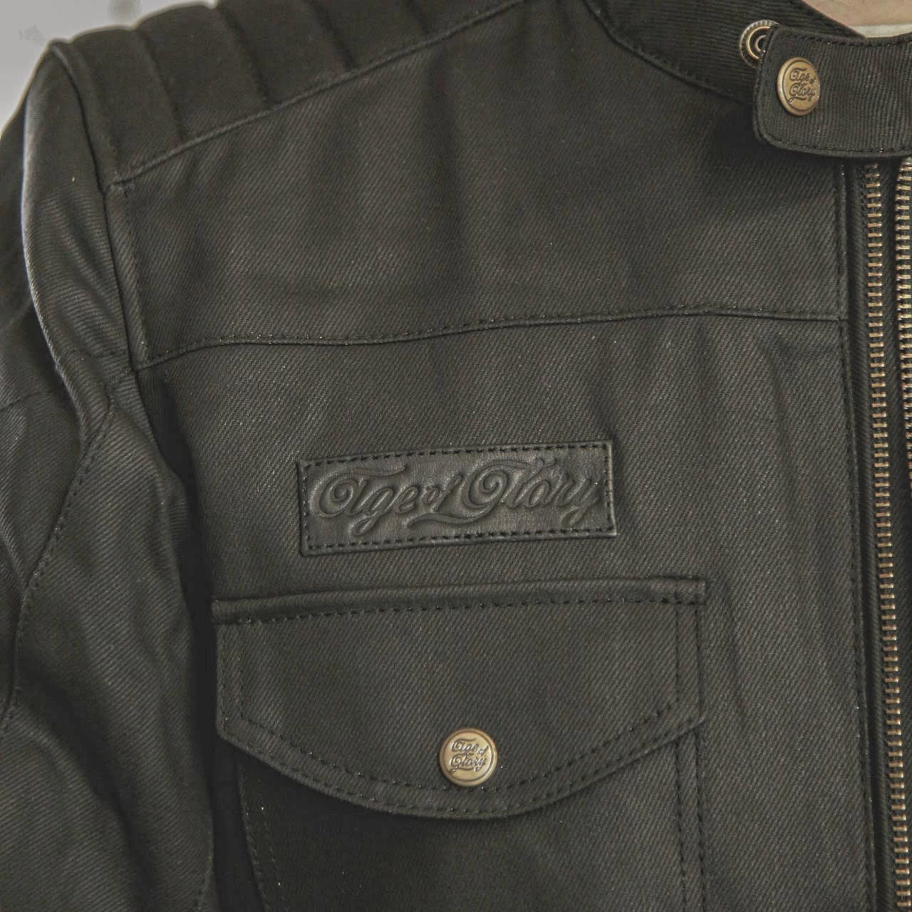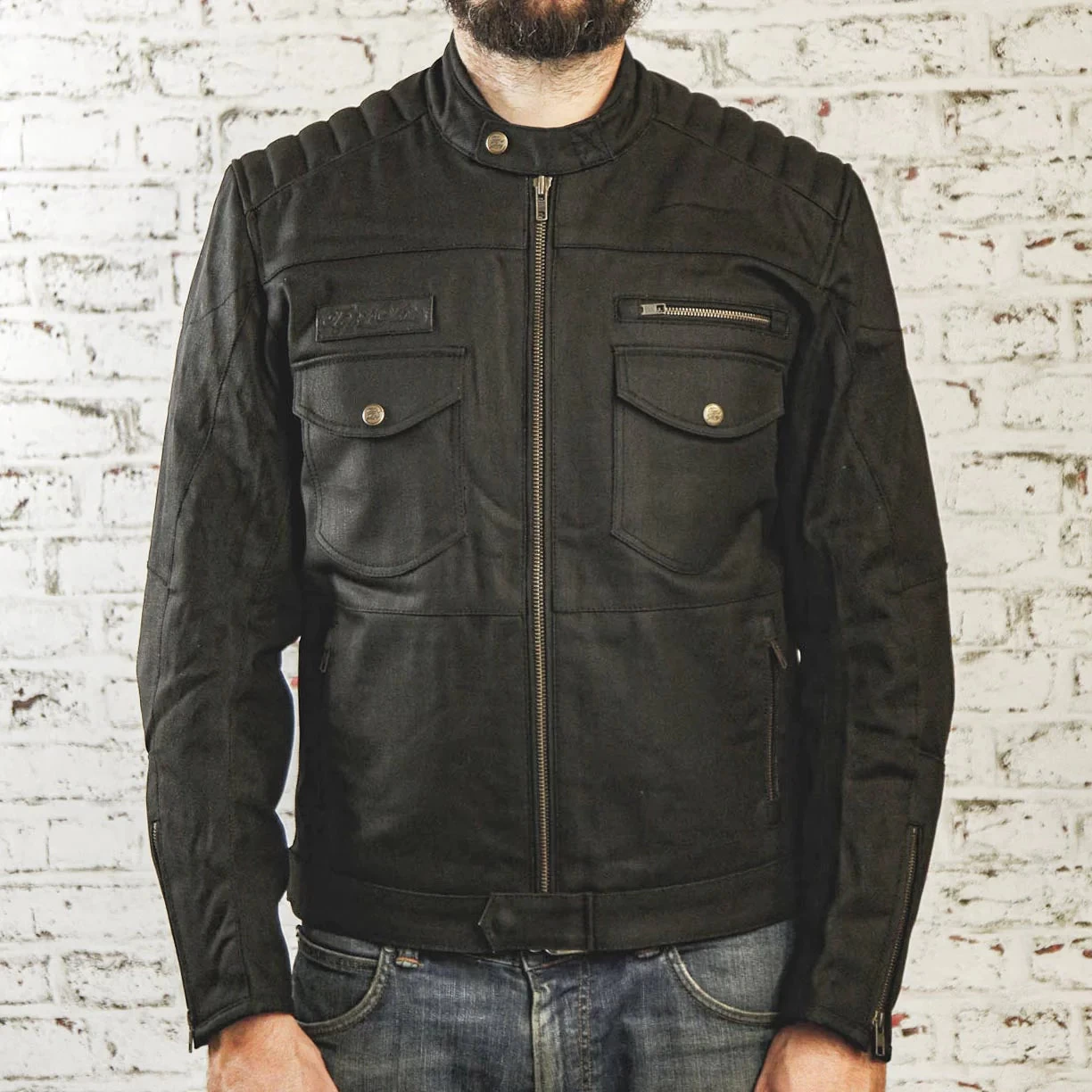 It is made from a 12ox waxed cotton on the outside, with a waterproof membrane inside and a satin lining housing pockets for back, shoulder and elbow protectors. It is CE Certified to EN17092 with a AA rating and comes with flat, thin and flexible CE Level 2 armour at the shoulder and elbow.
