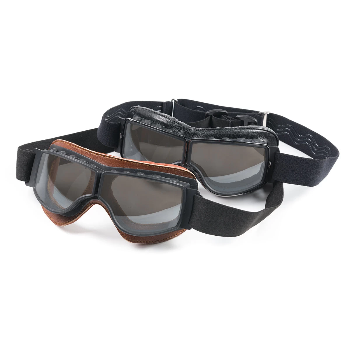 Classic/Cafe Racer style wraparound and squared goggles with a lambskin cushion, and adjustable elastic and leather band. These really are great value for money!