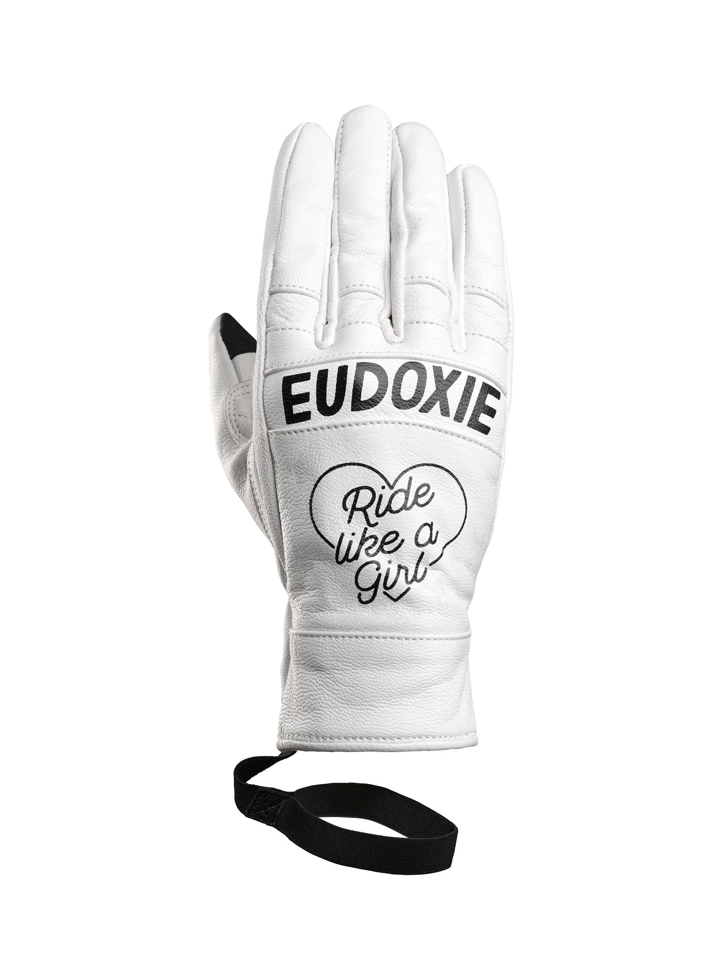 On the left hand, the one used to make the famous “V” which allows to greet the other bikers, we wanted to add our touch “Eudoxie”. You can read our famous phrase “Ride Like a Girl ” as a signature of our crew, and a greeting when you ride!