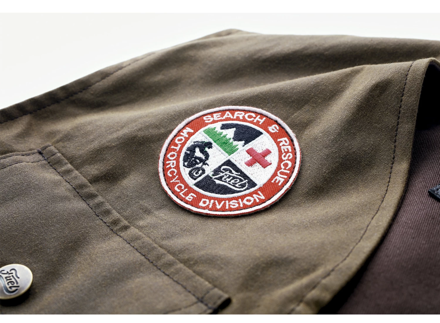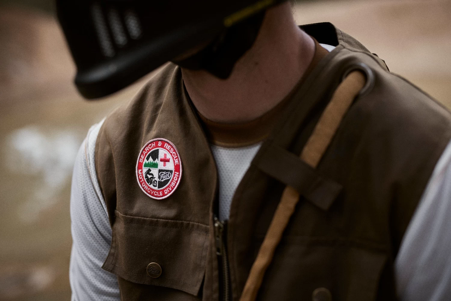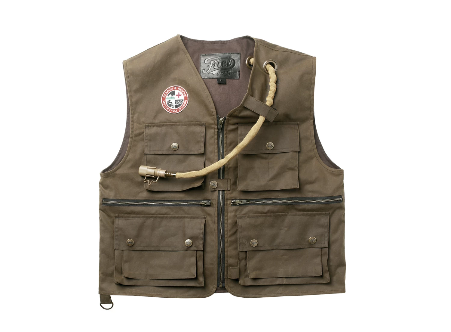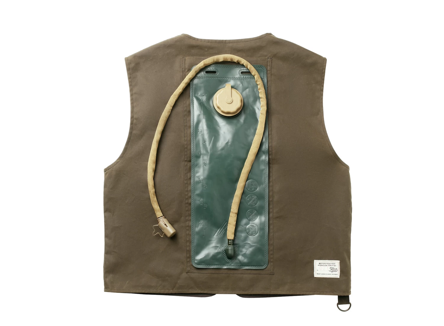 The “Peak” vest design was inspired by WW2 pilot life jackets, meant to be manually inflated if falling into the water. This is why you can see the phrases stamped next to the hydration pack (“Tube for hydration” and “Keep closed after use”).