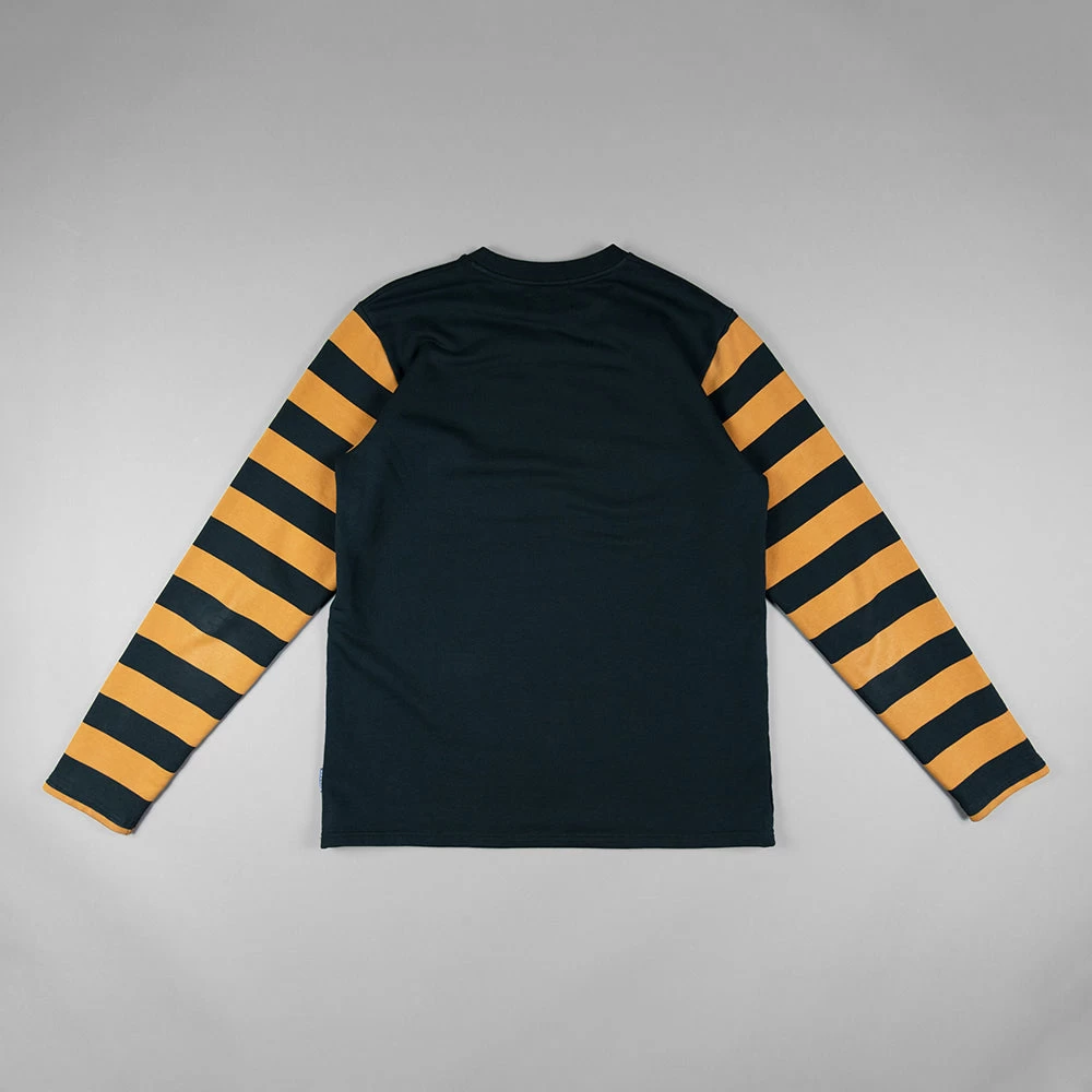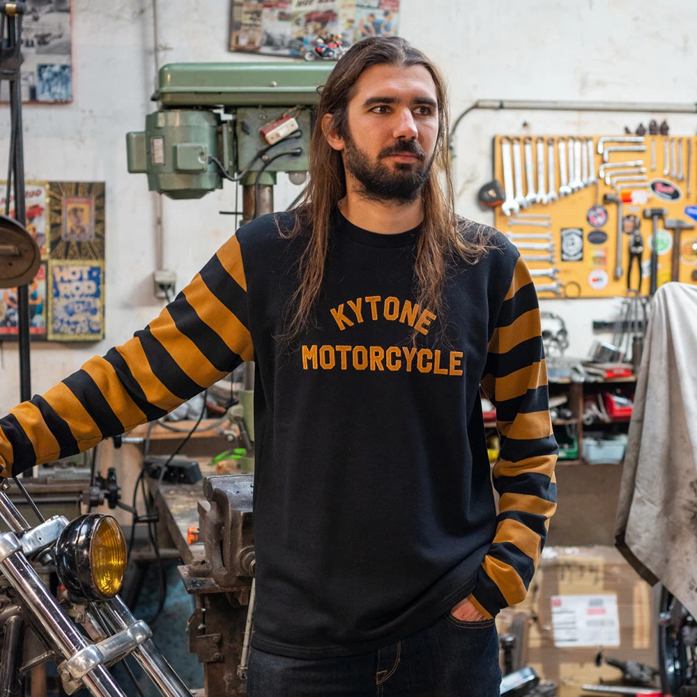This Sweater is a 350gm 100% cotton sweater harks back to old school motorcycle racing jerseys from the 40’s and 50’s. The yellow and black striped arms are really eye catching and the Bee has Kytone lettering embroidered on the chest. Great for layering up with a vest jacket.