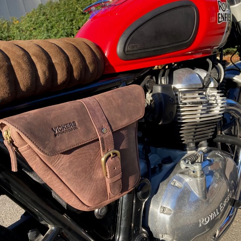Handcrafted using sumptuous *black leather side panel bags for the Royal Enfield Continental and Interceptor 650’s by Vickers Motorcycle Company.