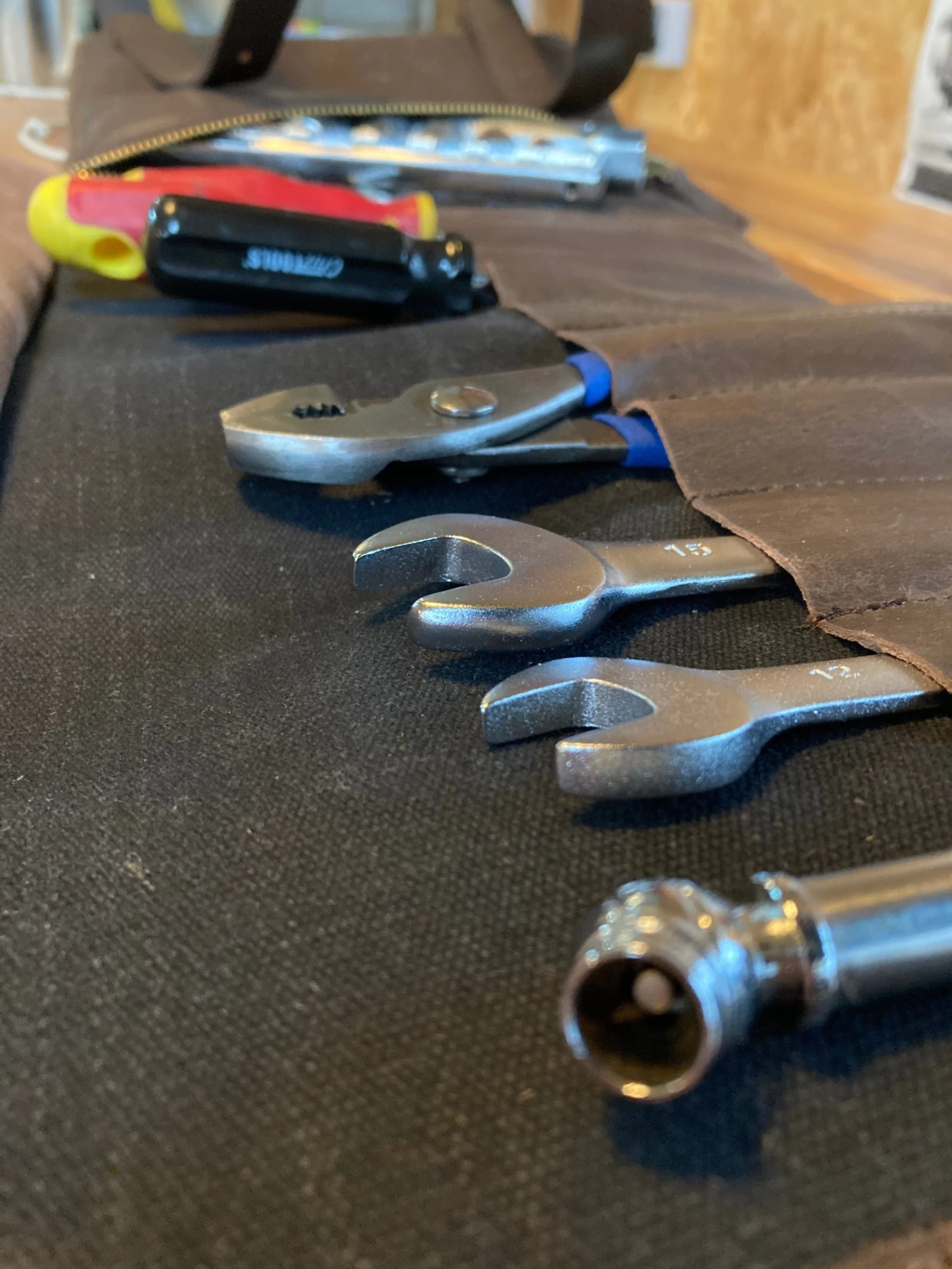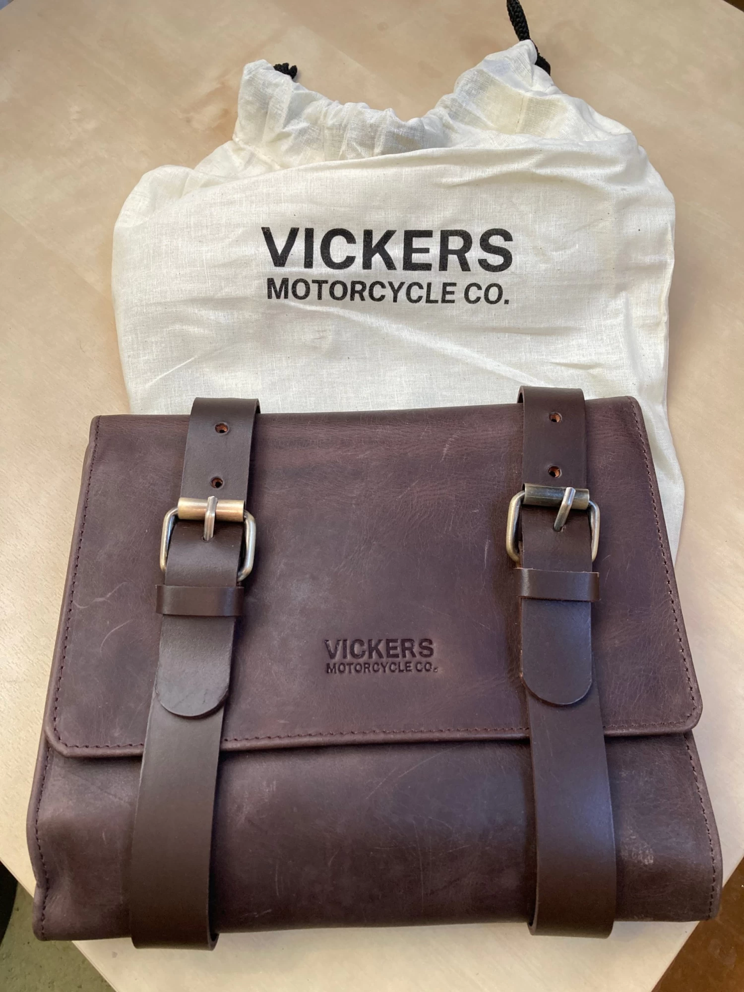 The roll itself has 11 cotton lined spaces for your tools and a zipped pocket (for your 10mm & 13mm sockets) and a leather flap that folds over to make sure everything stays in place. It’s hand crafted in thick full grain aged brown leather. Unrolled the dimensions are 54cm x 23cm. The tool roll is packed in a Vickers cotton presentation bag.