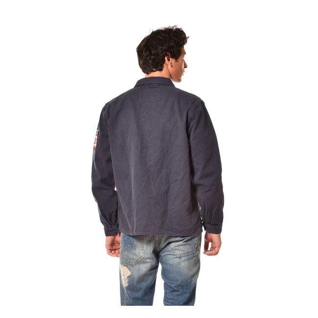 A worker style shirt/jacket by Von Dutch. It’s made from 100% heavy cotton which is what you would expect for a worker style garment. There is a sewn on embroidered patch on the left arm and a Von Dutch applique on the bottom left outer pocket. There are three outer and one inner pockets.