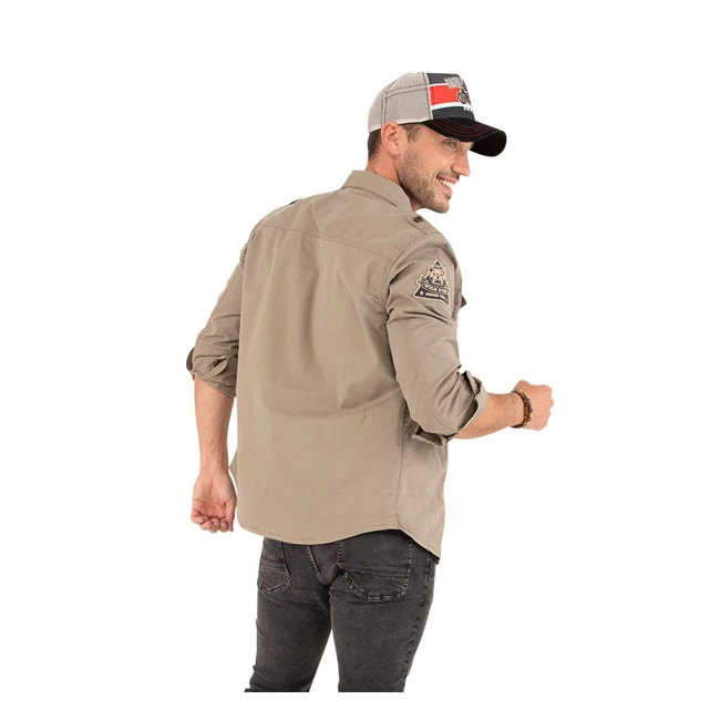 We love this genuine Von Dutch khaki shirt. It’s made from 100% cotton with sewn on embroidered patches on the sleeves and a Von Dutch applique on the shirt’s hem. Two chest pockets and shoulder epaulettes.