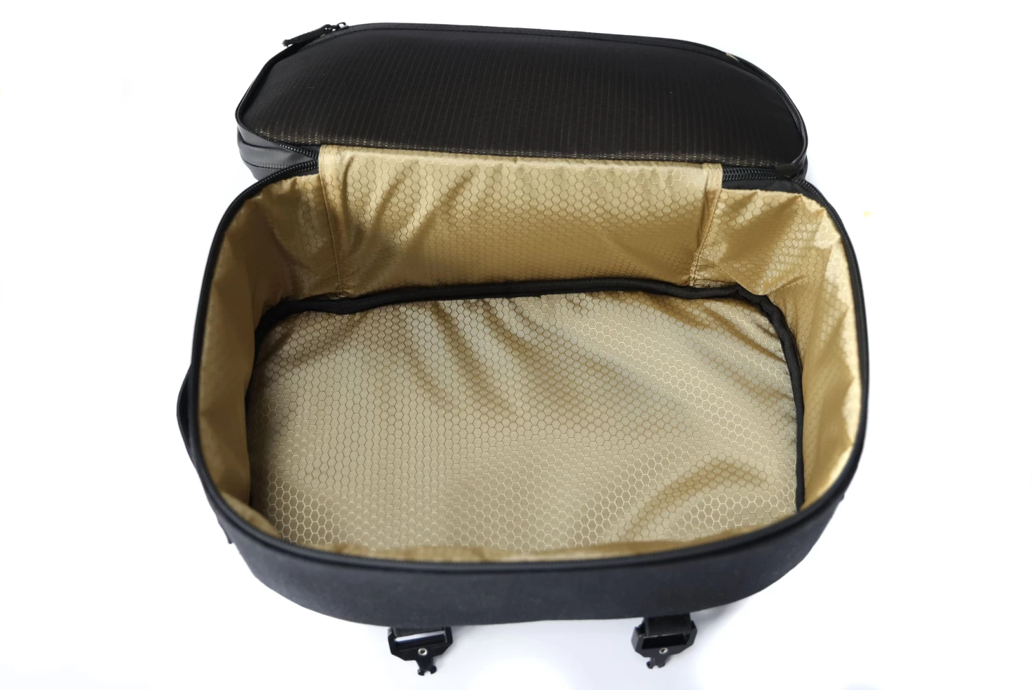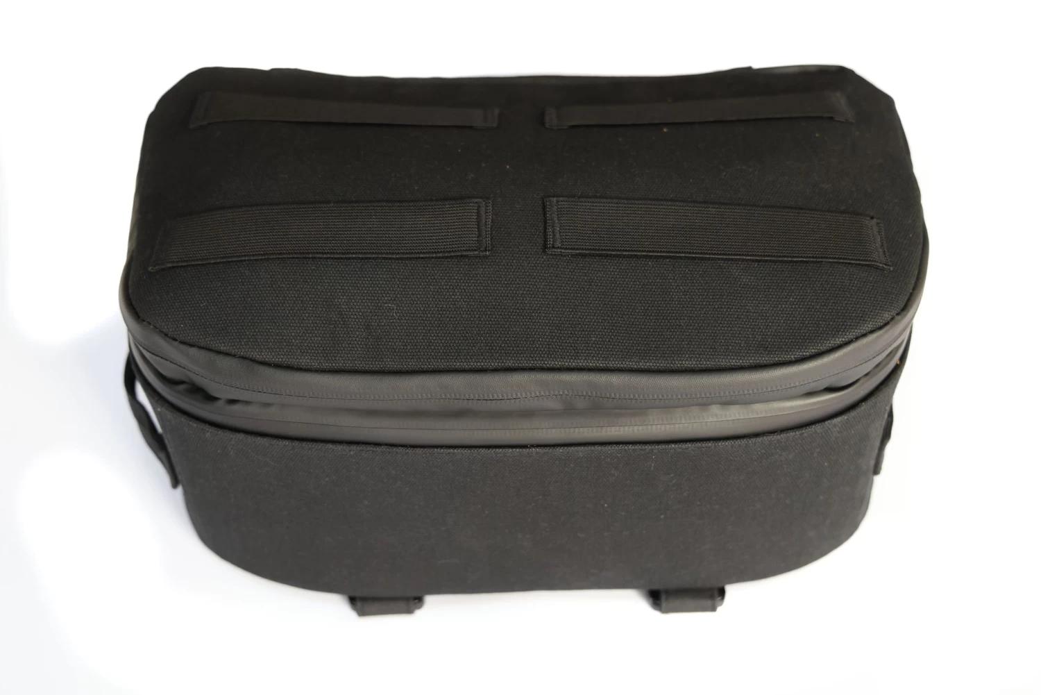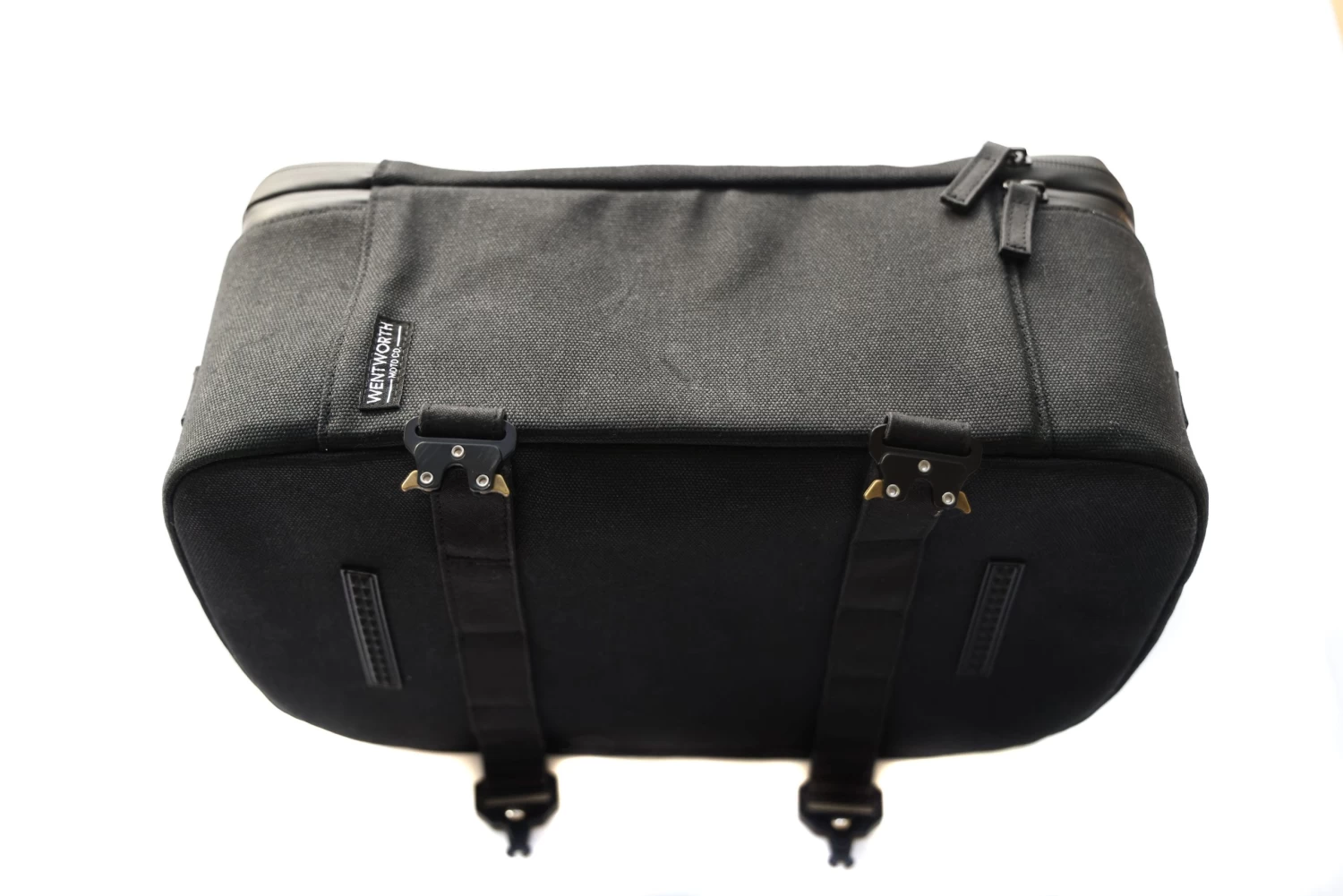 Unzip the top compartment and unfold the wax cotton backpack, complete with waterproof zippers, an internal mesh pocket and corduroy base to protect your helmet – because yes, your helmet will fit inside!
