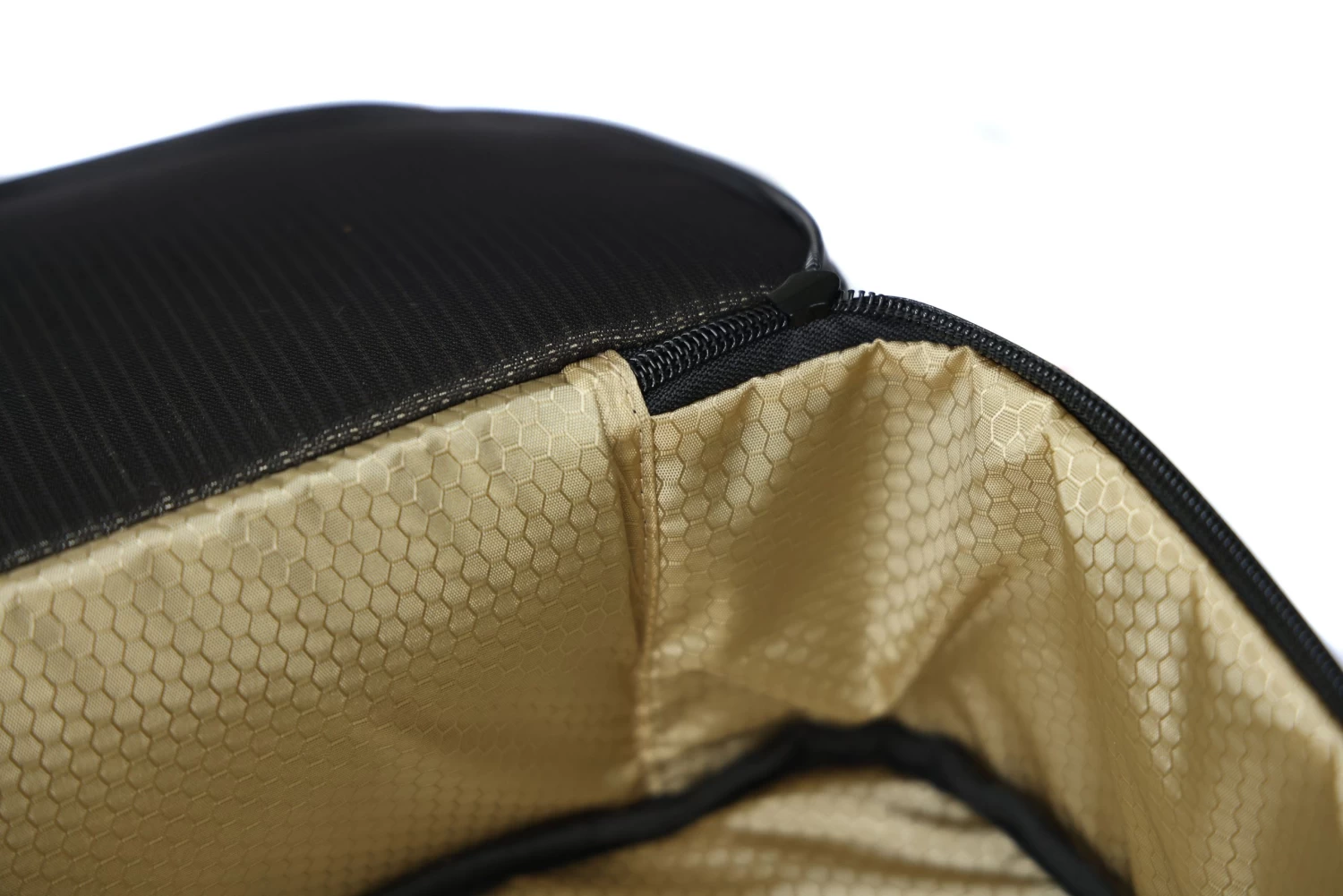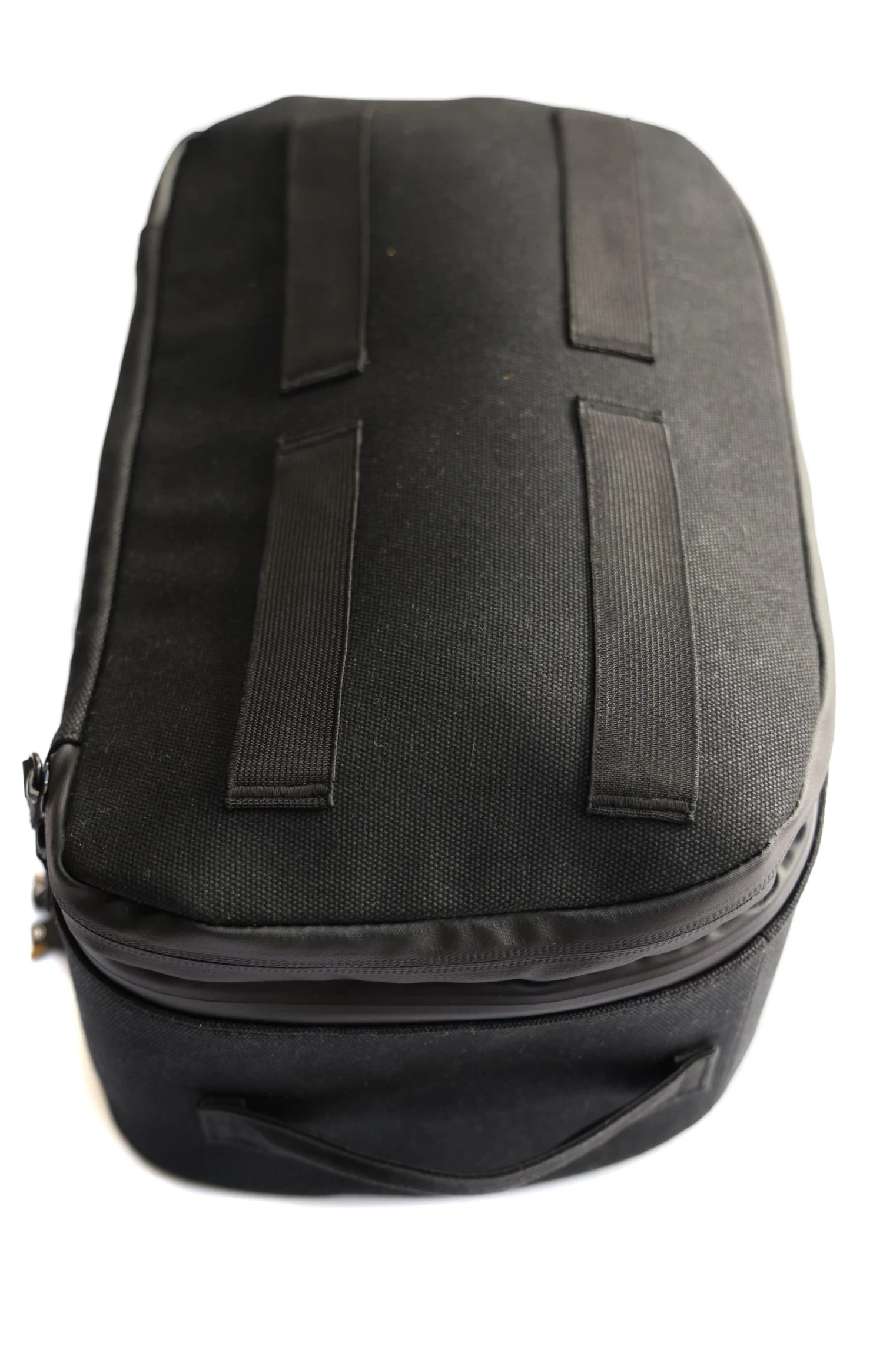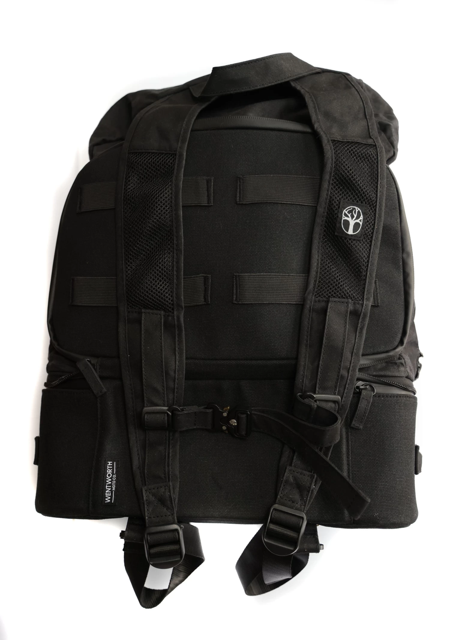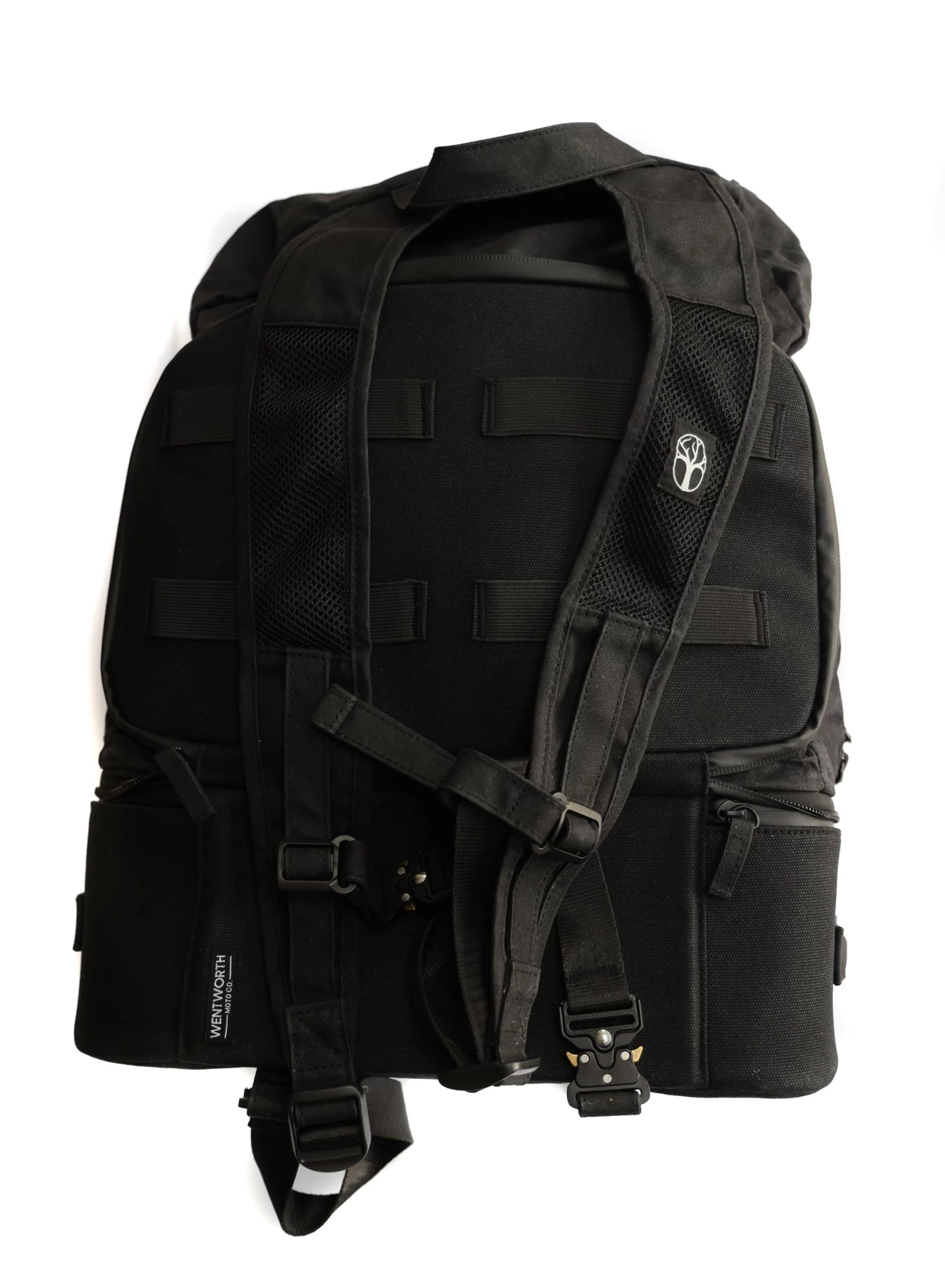 Unzip the top compartment and unfold the wax cotton backpack, complete with waterproof zippers, an internal mesh pocket and corduroy base to protect your helmet – because yes, your helmet will fit inside!
