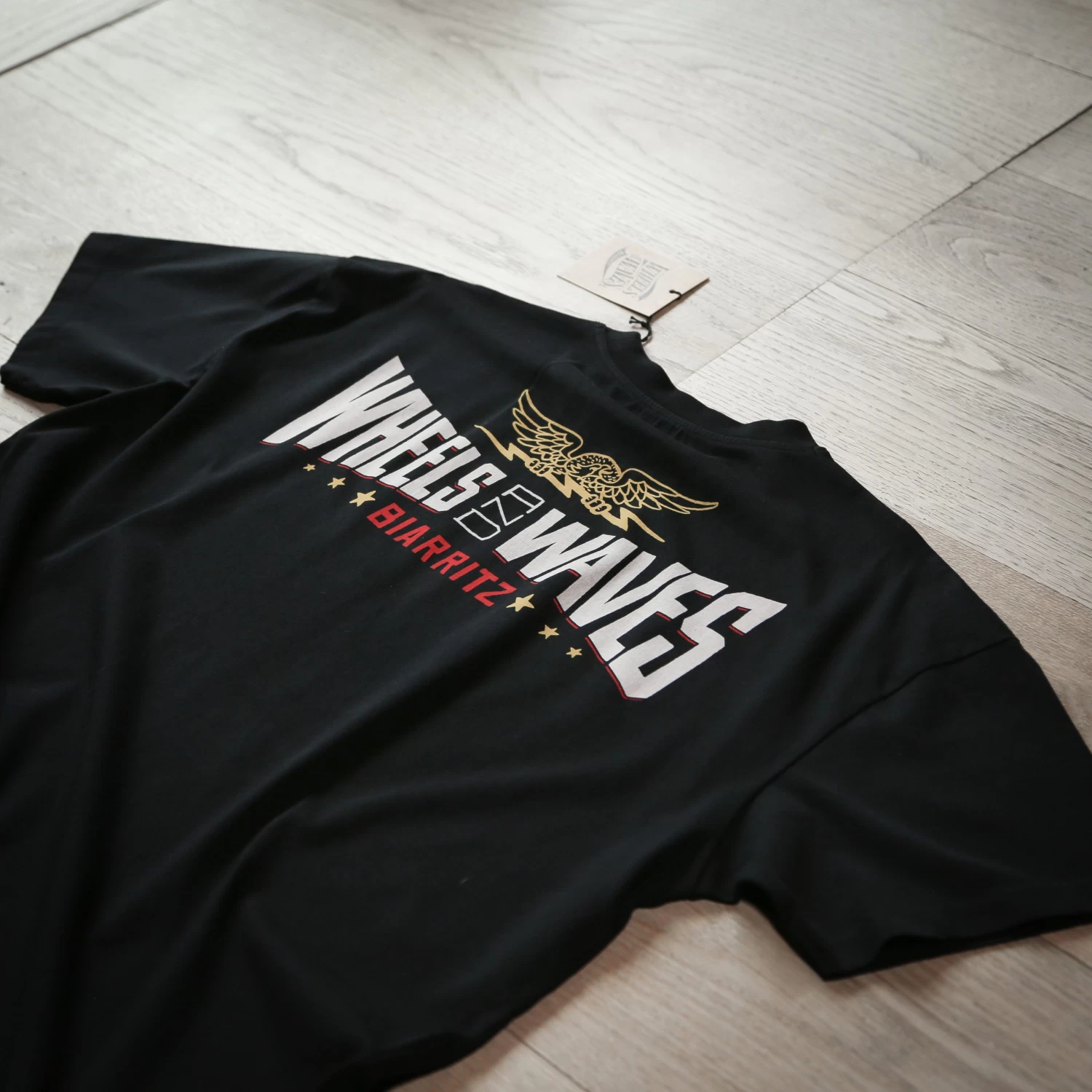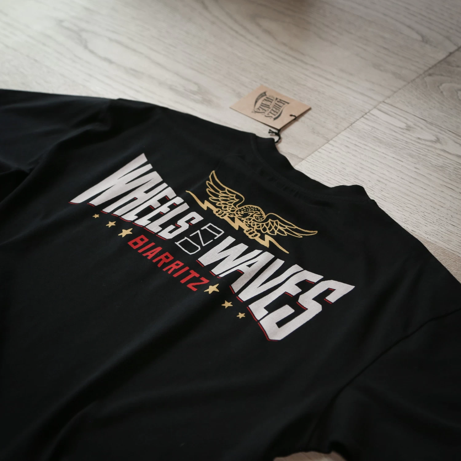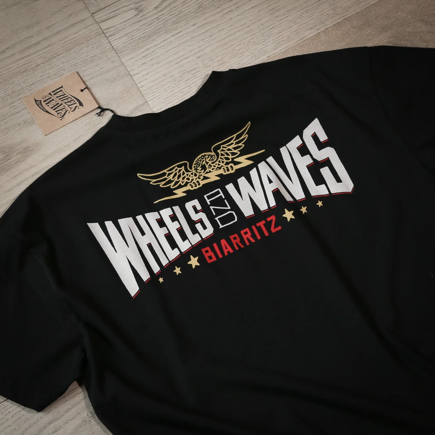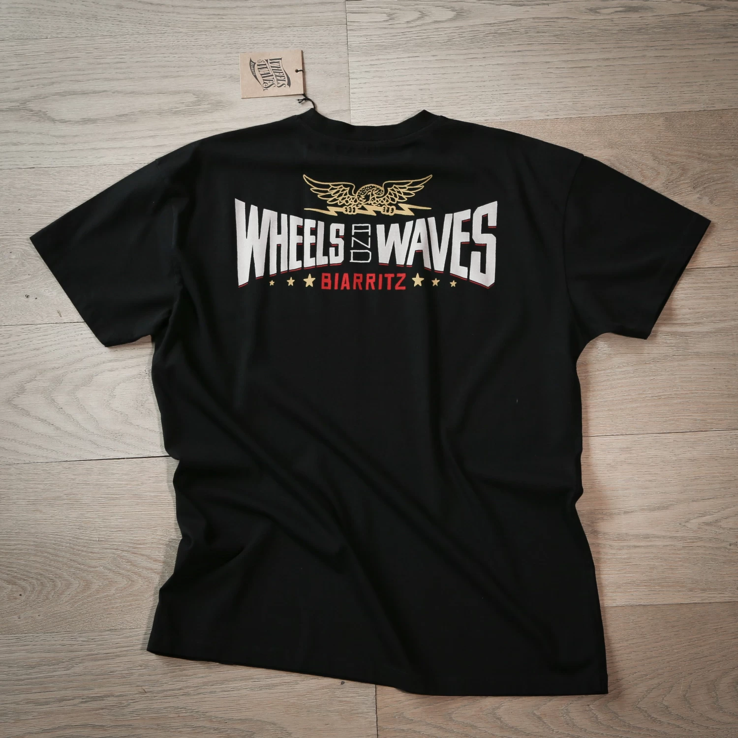 This eagle-crowned logo, designed by New Yorker Jon Contino, first appeared at Wheels and Waves Cayucos, California. It has since become part of the Wheels and Waves iconography and naturally found its place on the back of this T-shirt.