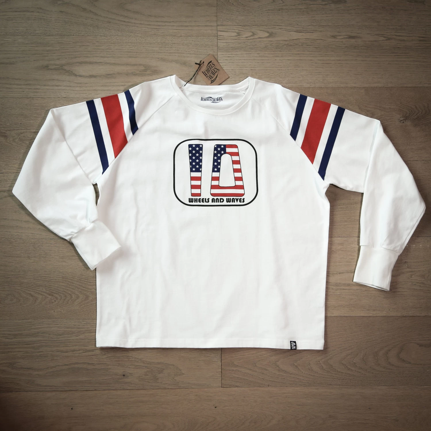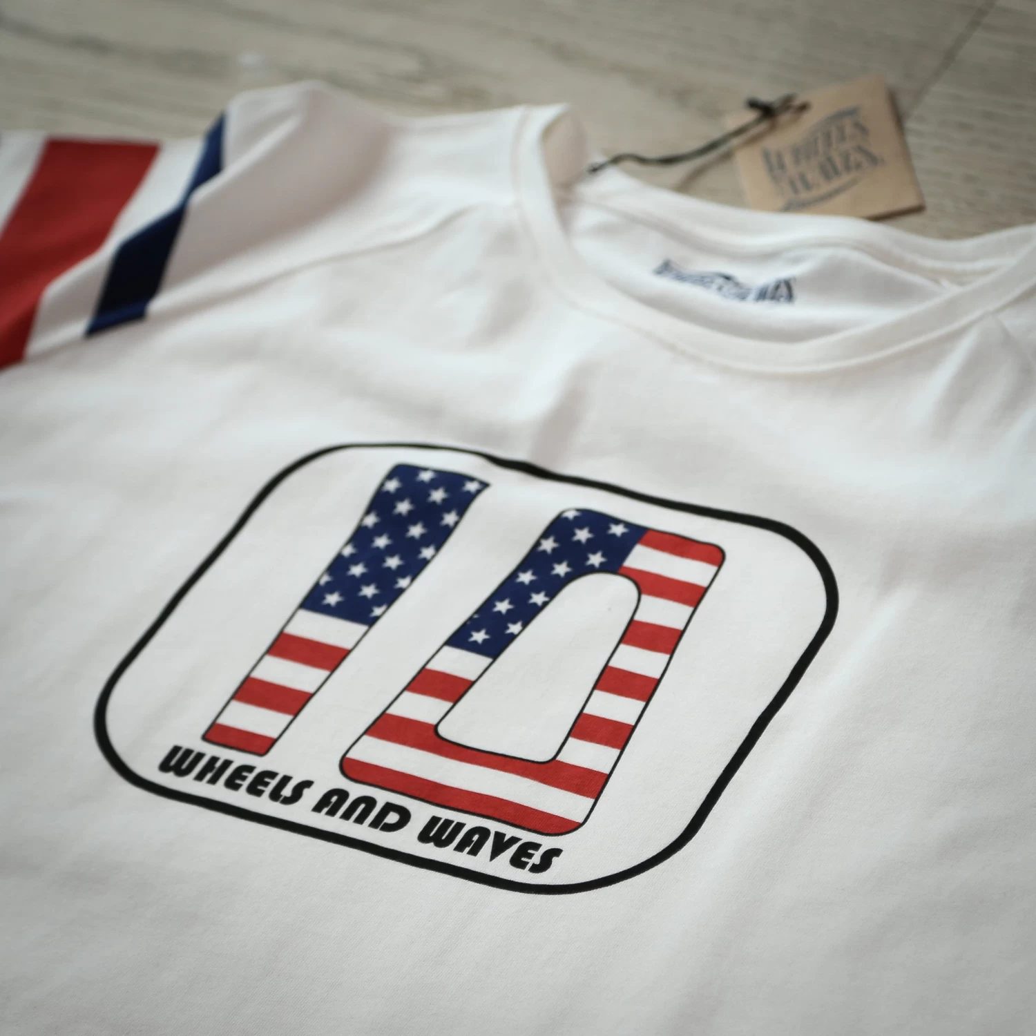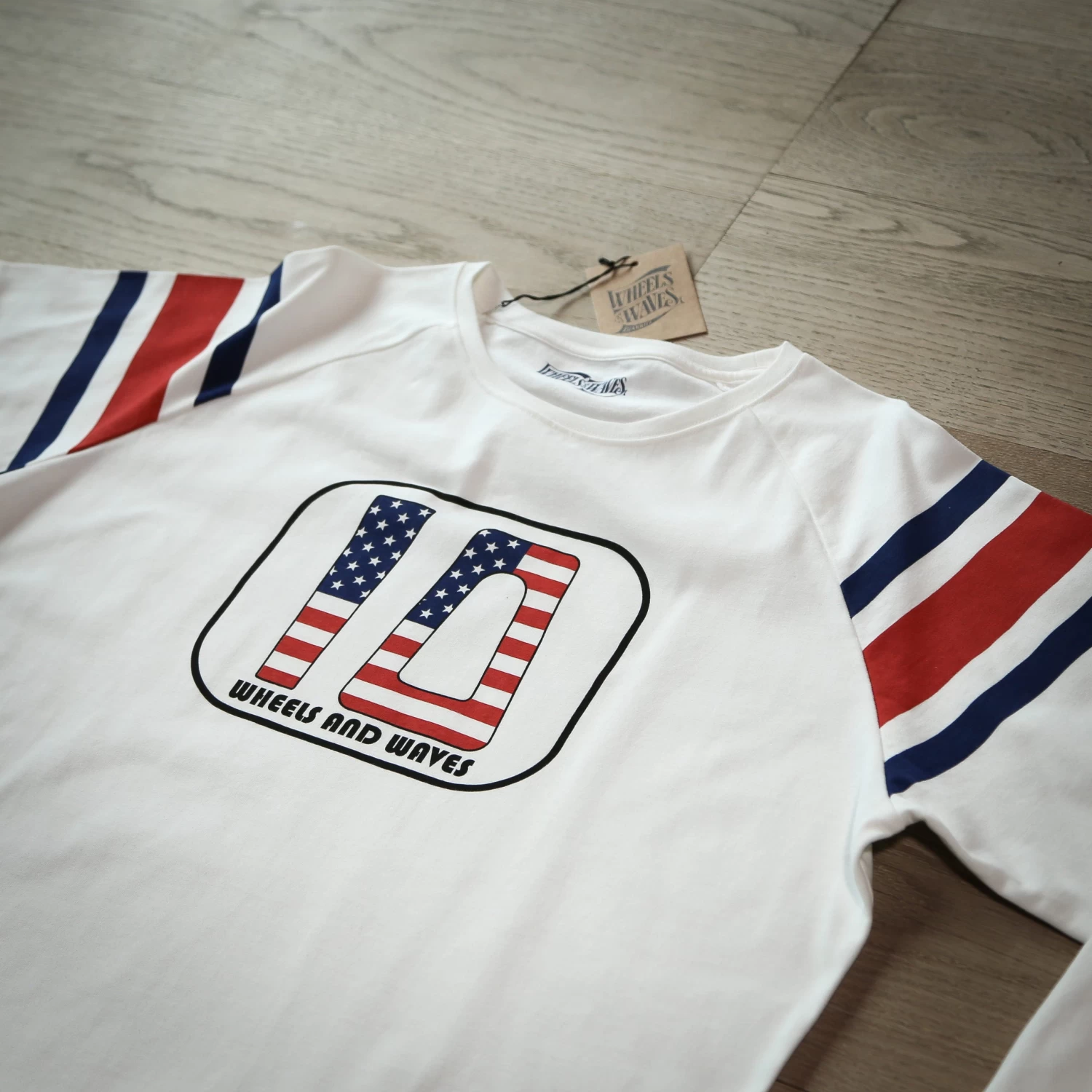 Made of a thicker, more comfortable and durable cotton, this raglan sleeve T-shirt is inspired by the racing T-shirts of the 70s. On the chest, the No. 10 plate pays tribute to the 1966 BSA Hornet that came all the way from the United States to bite the dust on the Wheels and Waves tracks.
