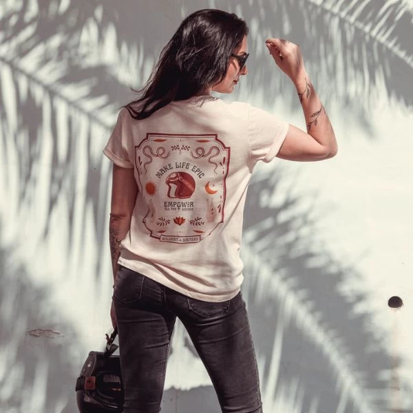 The adventure is not necessarily to go and visit the other side of the world… To us, it is means being in action, doing something that we dream of, that scares us, a personal challenge ! Faithful to the illustrations of spiritual inspiration, we engraved – as in an Egyptian cartouche in which the Hieroglyphs would invoke a deity – the adventure, the freedom, the risk and the sorority… All respectively represented by the helmet, the flags, the snakes and the protective hands of the “sisters”. Like an incantation, or a recipe for freedom. In this illustration, we also wanted to remind that the adventuresses inspire other adventuresses, and that there is a powerful, strong commitment in the female community, which gives power back to the sisters.